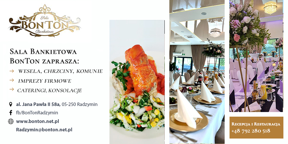 Nowoczesnej Sali Bankietowej mieszczącej się na obrzeżach Radzymina, vis a vis słynnego lądowiska - miejsca, od którego Papież Jan Paweł II rozpoczął swoją wizytę w Radzyminie. Nasza oferta pozwoli Państwu w różnorodny i oryginalny sposób wyprawić każdą uroczystość. Znakomite połączenie komunikacyjne z Warszawą i okolicznymi miejscowościami sprawi, że Bon Ton będzie doskonałym miejscem by przyjąć Państwa gości. Oferujemy Państwu menu przygotowane przez renomowanych kucharzy. Bogata oferta potraw pozwoli Państwu dopasować dania do charakteru przyjęcia. Bon Ton jest nową salą bankietową, ale posiadamy wiele lat doświadczenia w świadczeniu tego typu usług. Będzie nam niezmiernie miło, jeżeli powierzą nam Państwo tak ważne zadanie, a zaufanie jakim nas obdarzycie będzie naszą okazją, aby pokazać co potrafimy.  Będziemy dumni, jeżeli przygotowane przyjęcie spełni Państwa oczekiwania i będzie mogło być naszą wizytówką oraz okazją do ponownej współpracy.